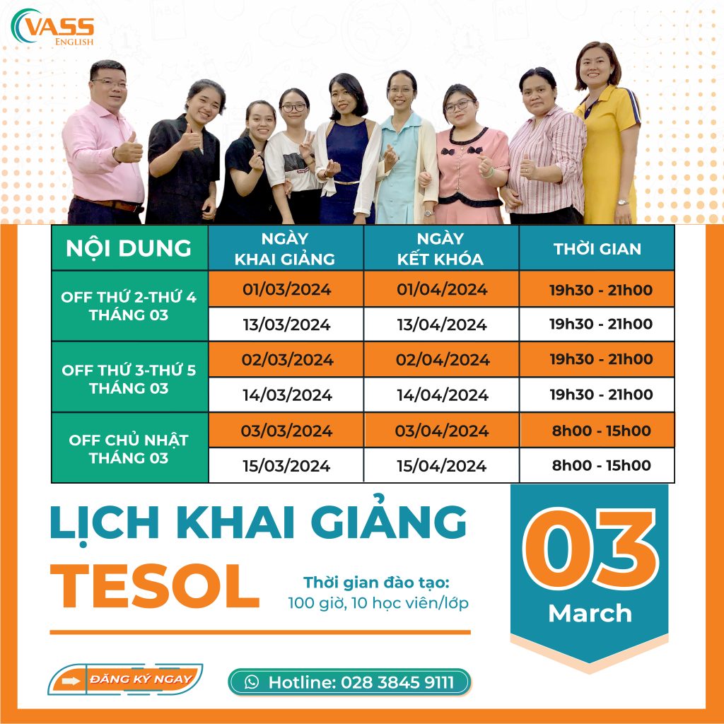 ⚡️KHAI BÚT ĐẦU NĂM – ĐĂNG KÝ KHÓA HỌC NGAY TRONG HÔM NAY – KHAI GIẢNG TESOL OFFLINE THÁNG 03/2024 ⚡️ 💥VASS ENGLISH thông báo cập nhật lịch học OFFLINE cho những bạn đang muốn tham gia khóa học TESOL sắp tới. 👨🏫Khai giảng vào ngày 01,02,03,14,15,16 tháng 03/2024. Trở lại làm bạn với kiến